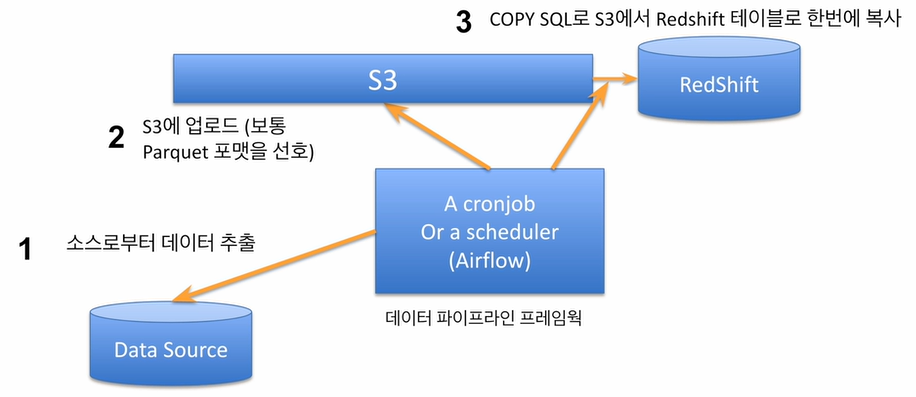 - 벌크 업데이트 지원 : S3로 파일 복사 → COPY로 Redshift에 일괄 복사